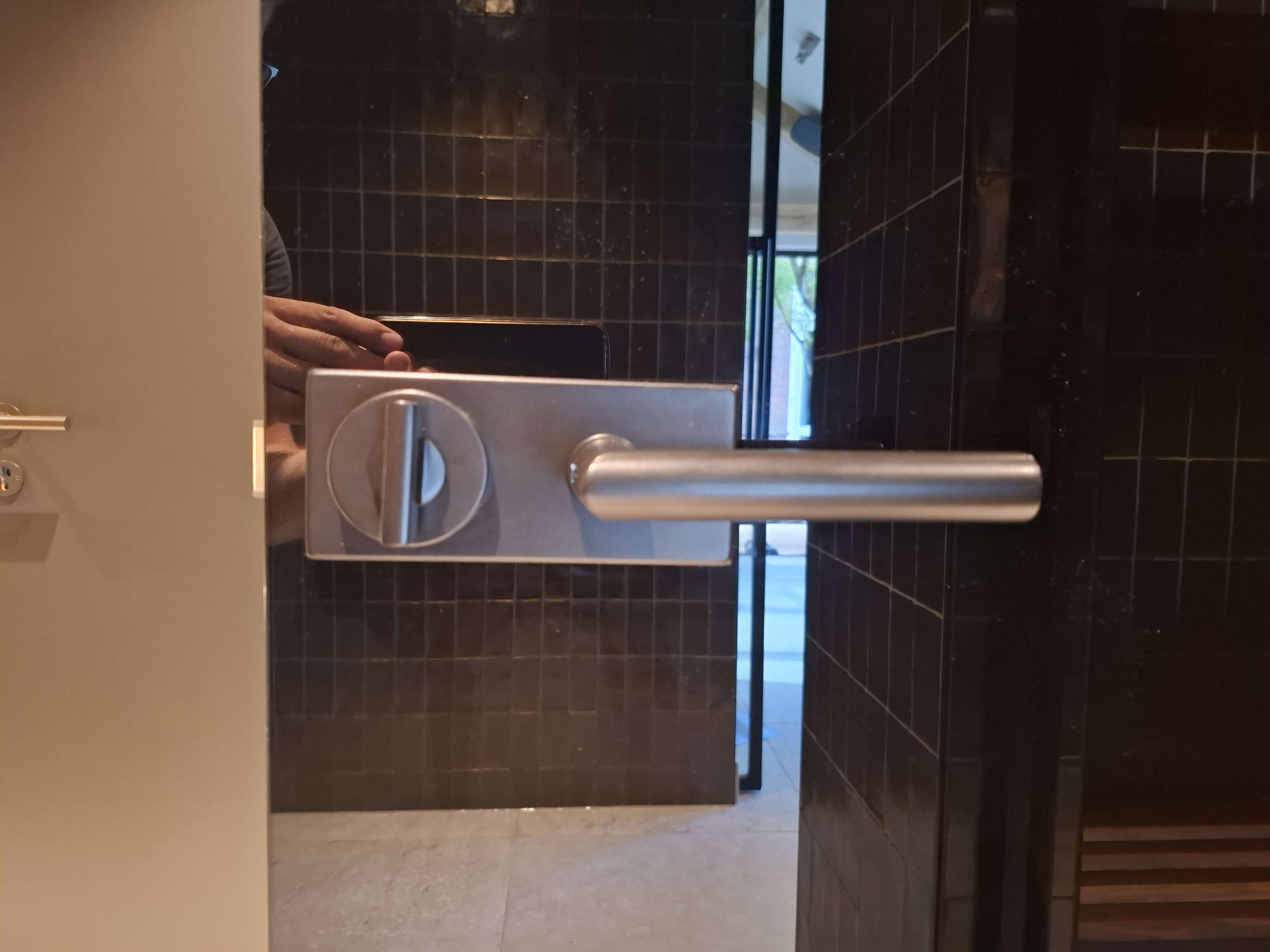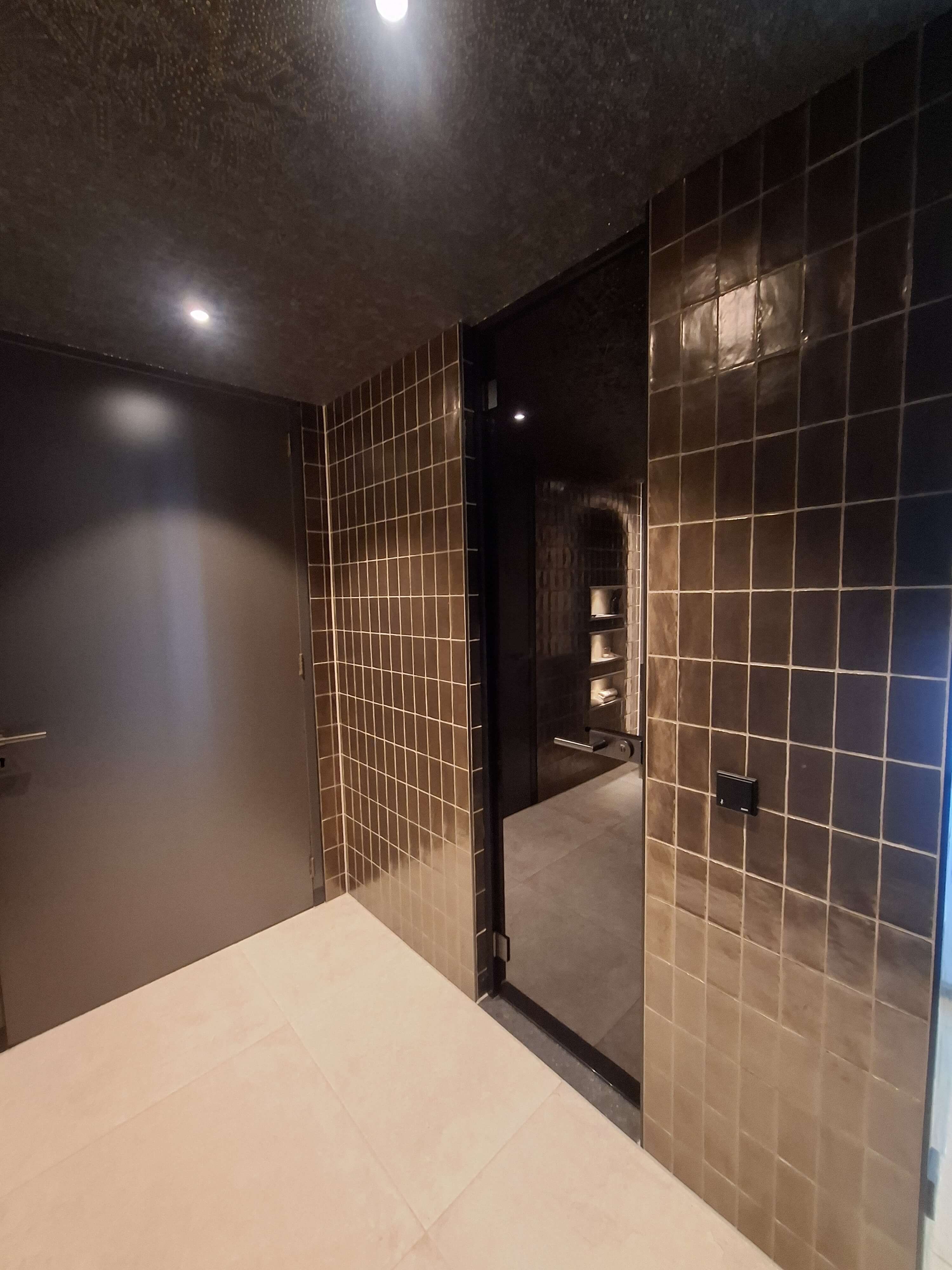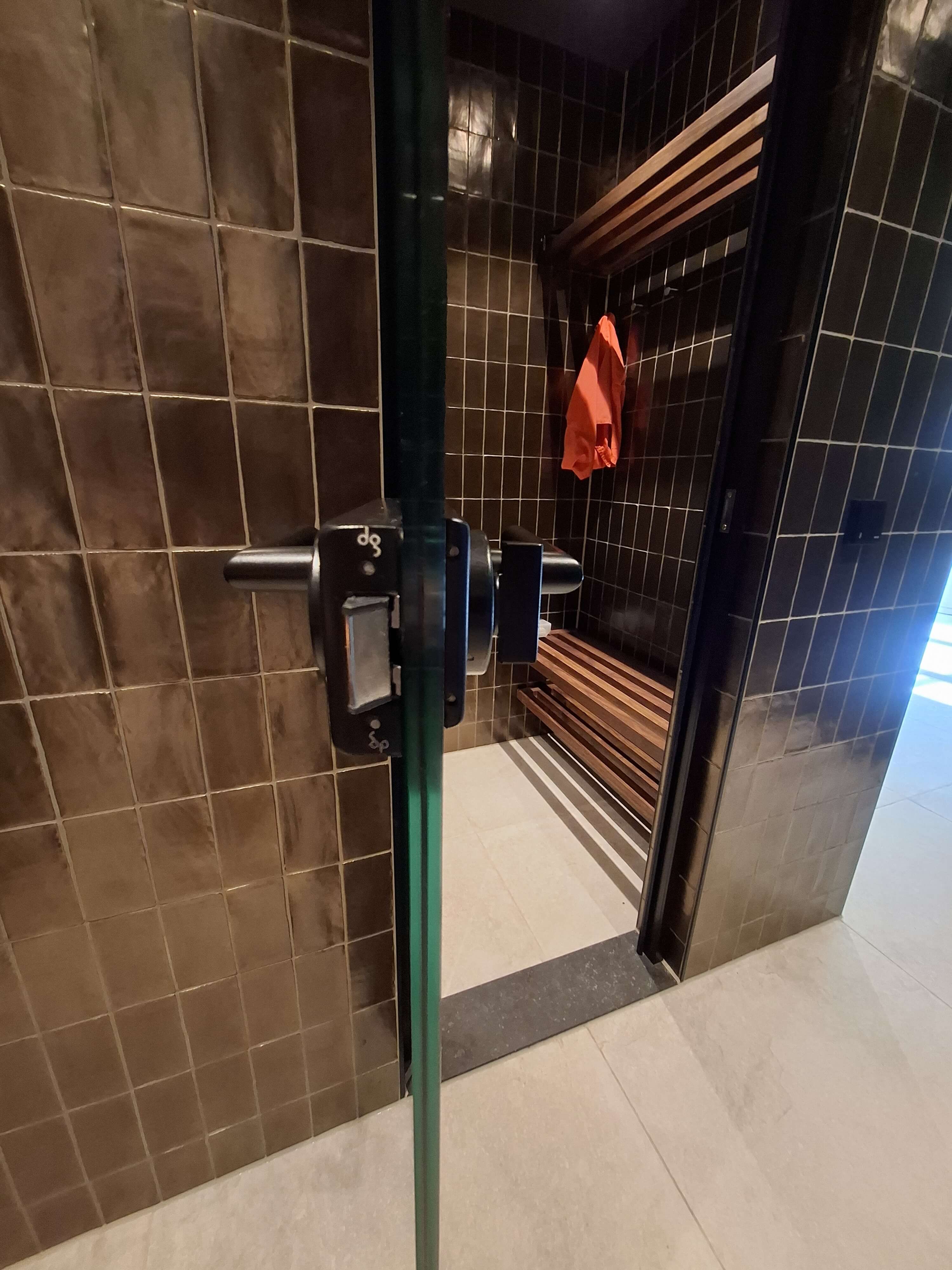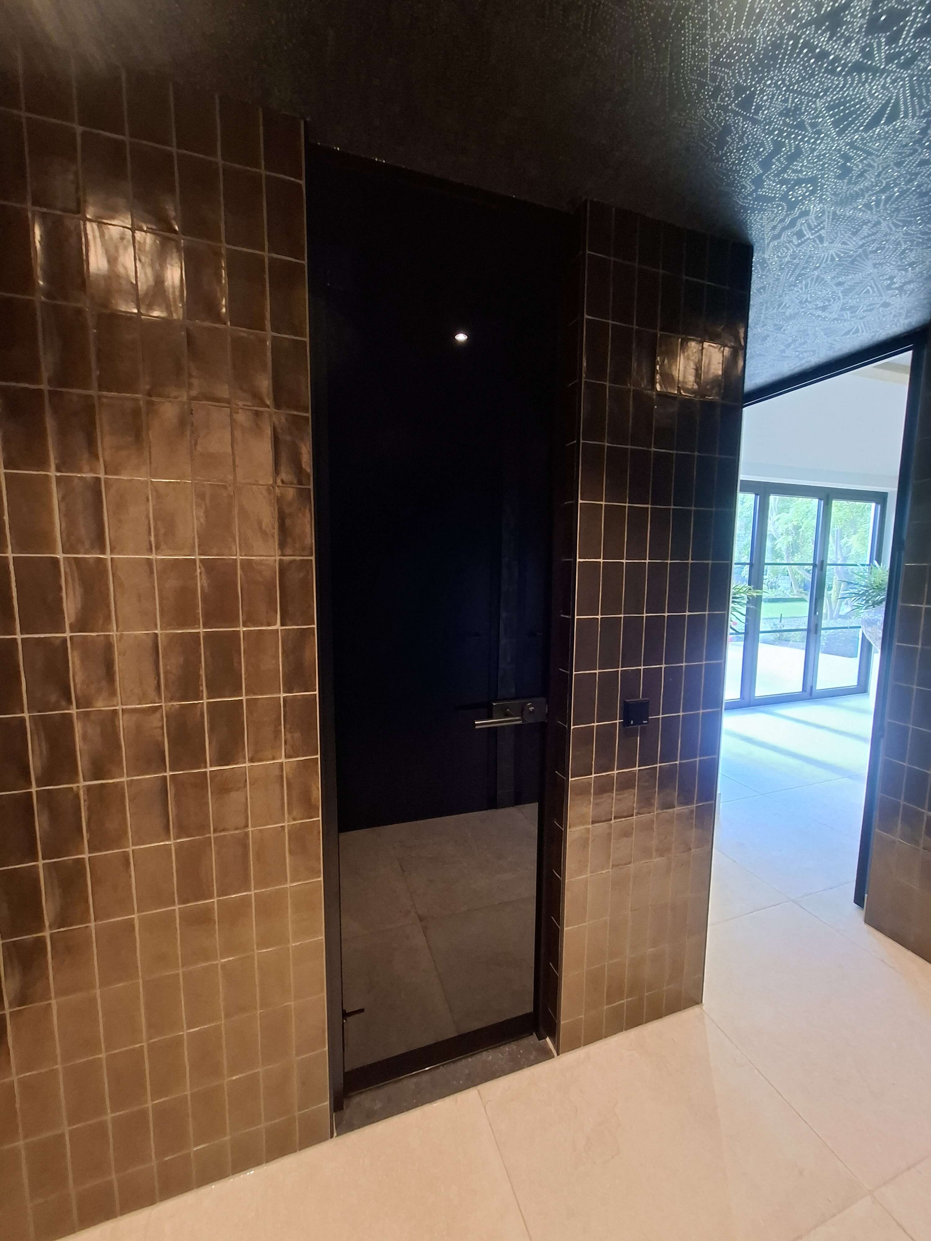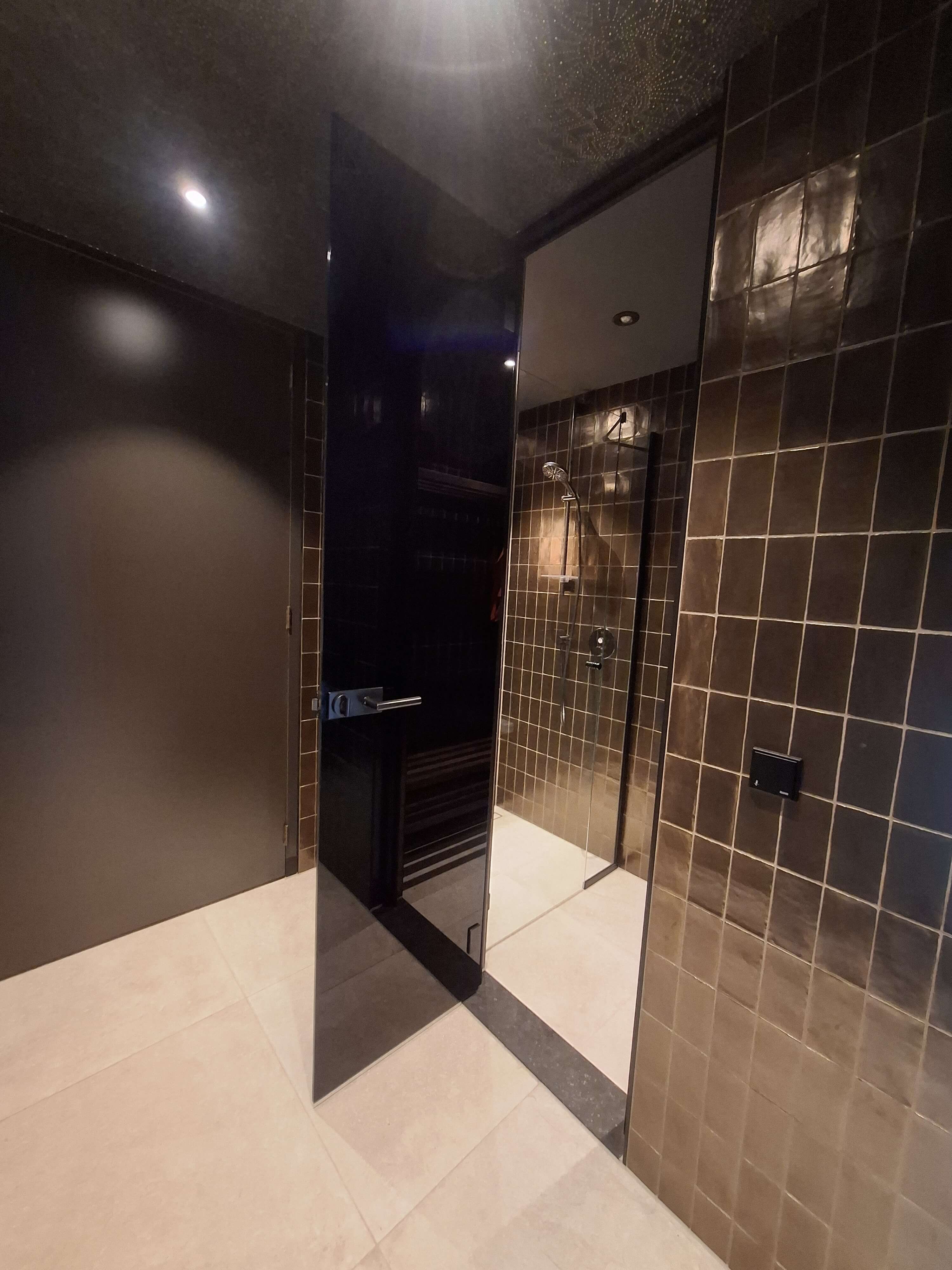 Bij deze opdrachtgever mochten wij de toegangsdeur tot de douche voorzien van een deur met aluminium kozijn. Het beslag is uitgevoerd in Ral 9017, Ook de deur is voorzien met een folie met ral kleur 9017. En is 55.2 gelaagd- gehard. Het krukstel is voorzien van een vrij/ bezet slot.