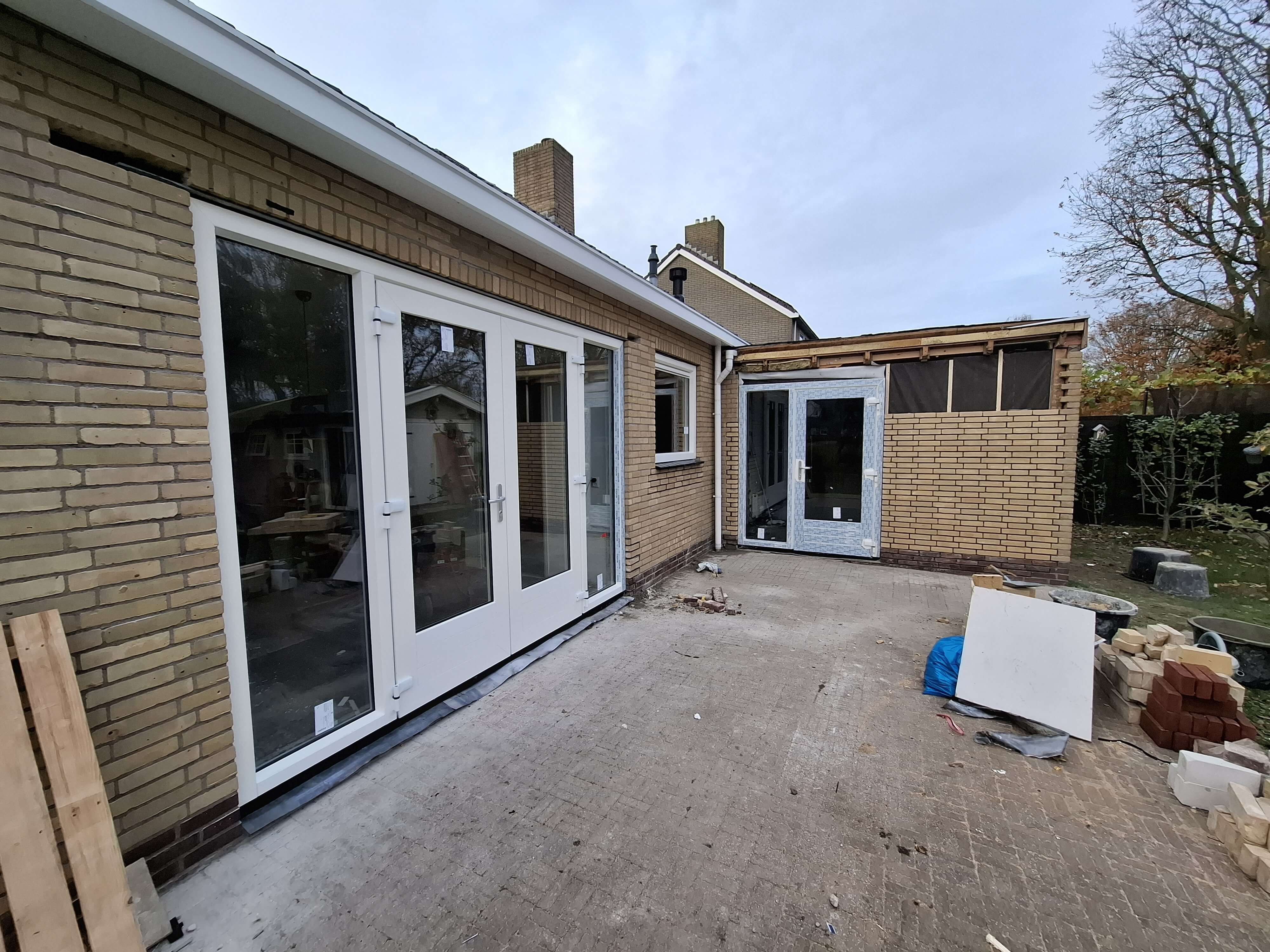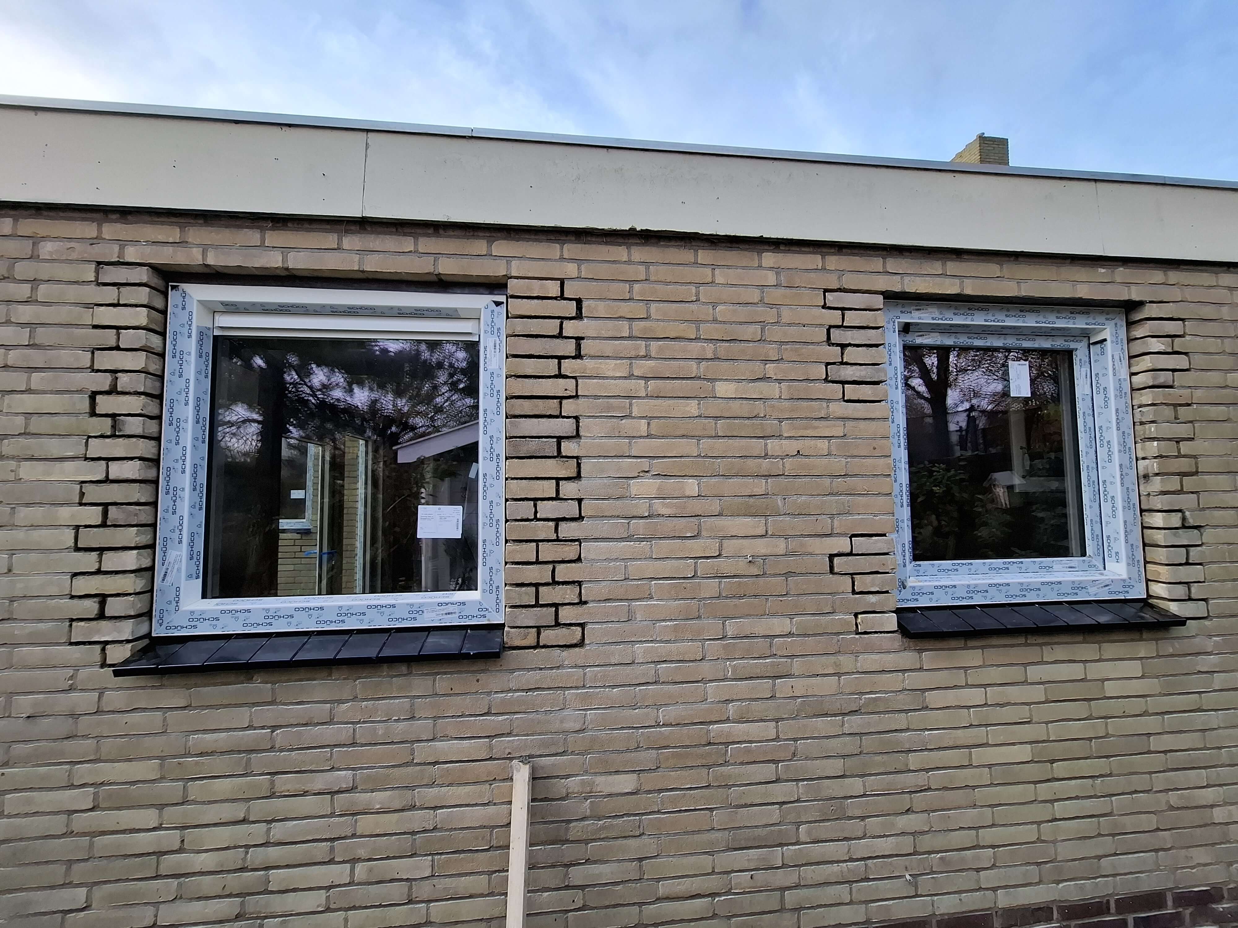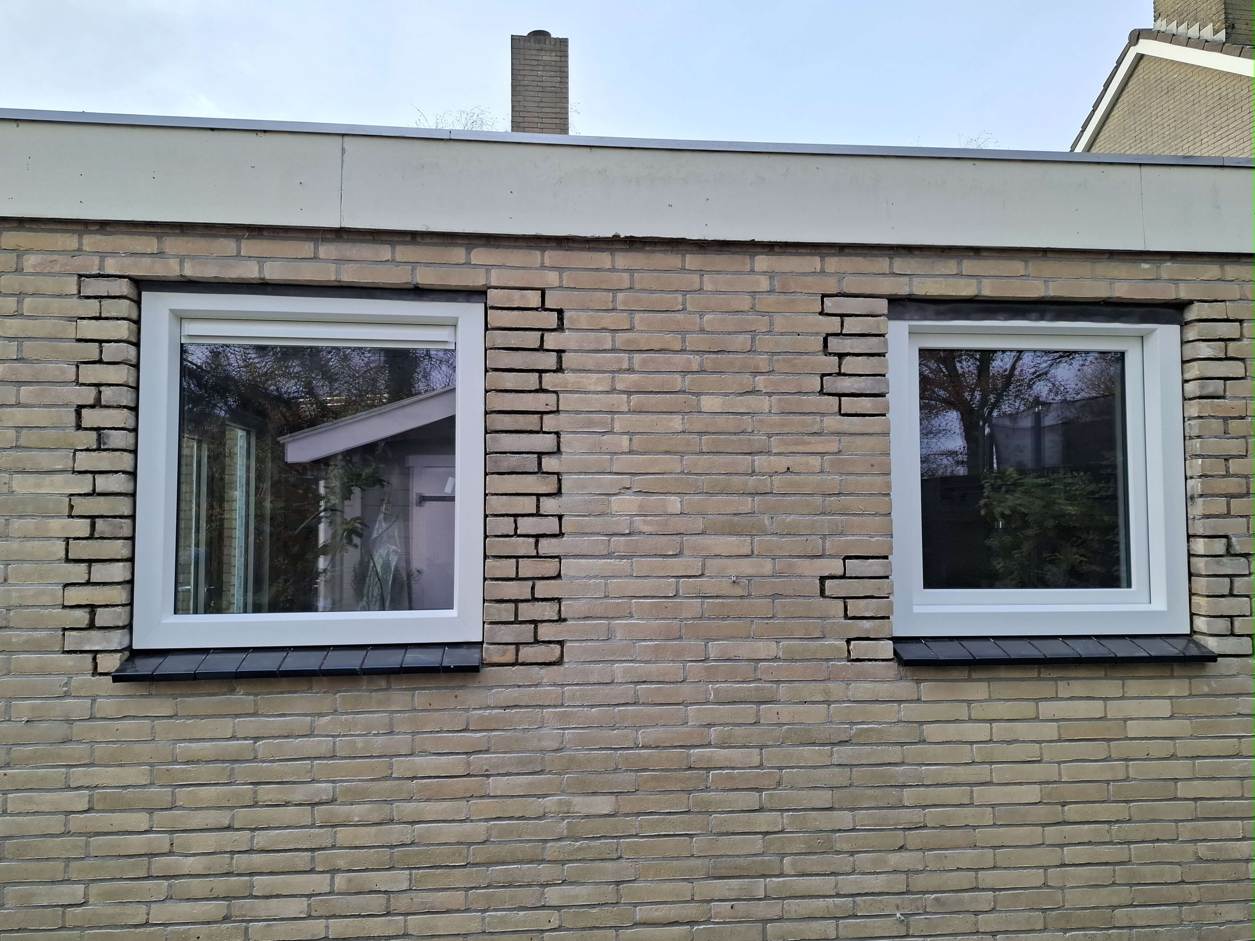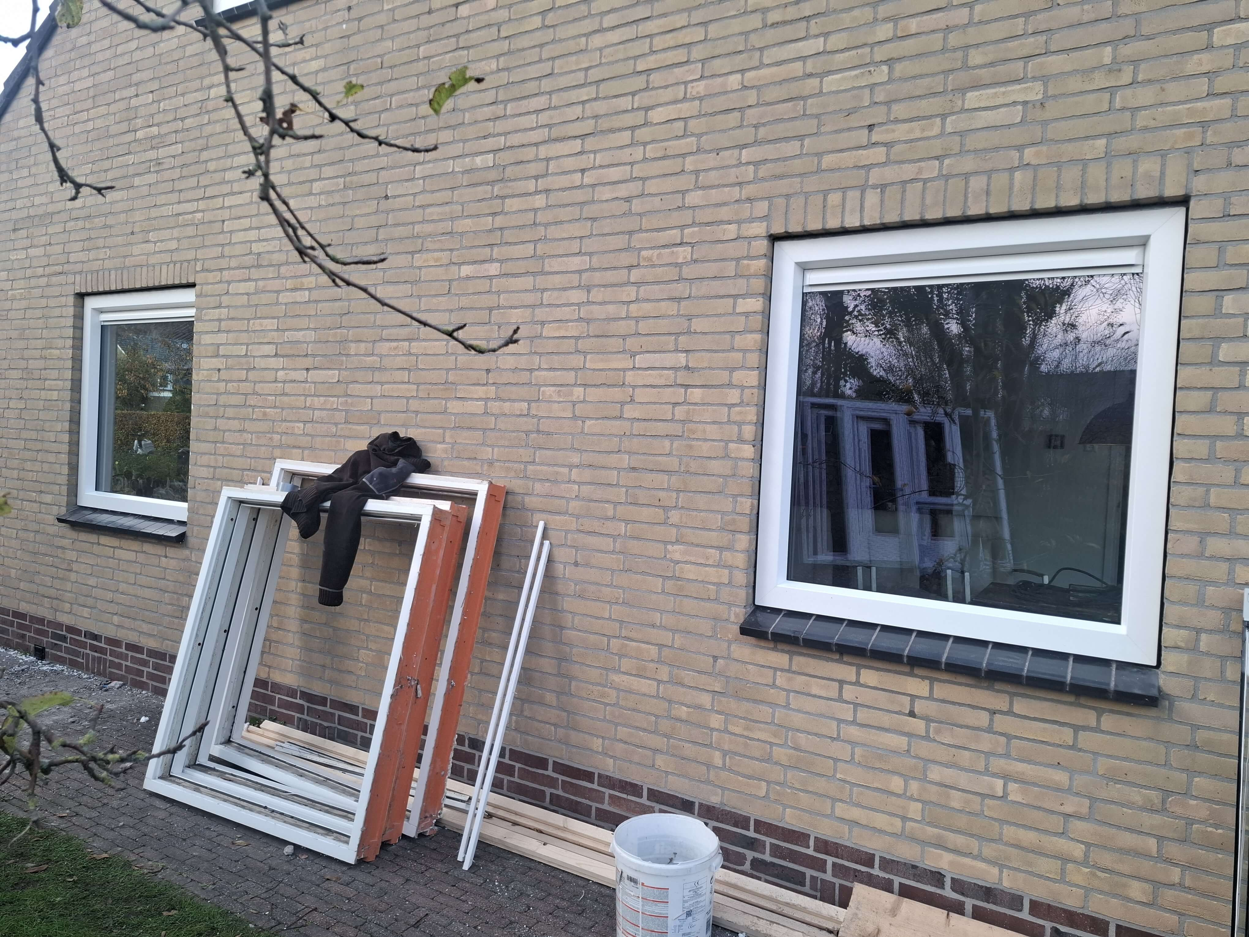 Deze woning hebben wij voorzien van kunststof kozijnen. De profielen zijn van SCHÜCO (living variant) rondom in 15 graden uitgevoerd. Met de hoeken 45 graden gelast. Dit omdat er al bestaande kunststof kozijnen in zaten. de scharnieren en roosters zijn ook op kleur geleverd. Buiten is uitgevoerd in Ral 9010 met houtnerf uitgevoerd. Binnen is glad Ral 9016 uitgevoerd. Dit is ook i.v.m. het schoonmaken. De kantel kiep ramen zijn bij ons standaard voorzien van zomer, winterstand en insectenhor. De deuren zijn voorzien van stapeldorpels, dit lijkt het meest op de borstwering van een houten deur. De deuren gaan op slot d.m.v. de driepuntssluiting. De deuren zijn beide voorzien een knopcilinder, dit is i.v.m. eventueel brandgevaar.